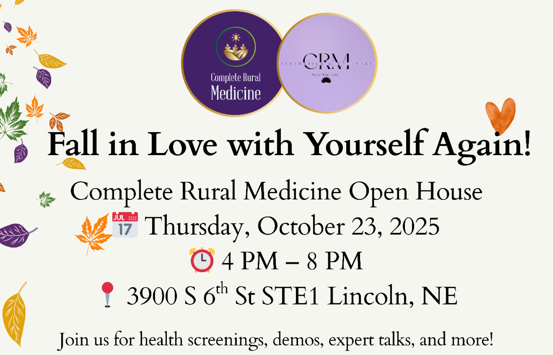 Fall In Love with Yourself Again A special event presented by Complete Rural Medicine & CRM Aesthetics ¡Vuelve a enamorarte de ti mismo! Un evento especial presentado por Complete Rural Medicine y CRM Aesthetics. RSVP BELOW hyee_para2025-09-22T21:10:19+00:00